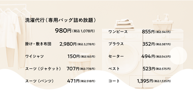 Yシャツ150円(税抜)、布団2,980円(税抜)と、街のクリーニング店と比較しても同等以下での価格を宅配クリーニングで実現しています。また、Tシャツやタオルなど家庭の日常的なアイテムを対象にした洗濯代行サービスは、コインランドリーと変わらない980円(税抜)で提供しております。さらに、プレミアム会員登録(月額:680円(税抜))で往路送料が何度でも無料になりますので、お財布に優しく、日常使いしやすい宅配クリーニングとなっております。
