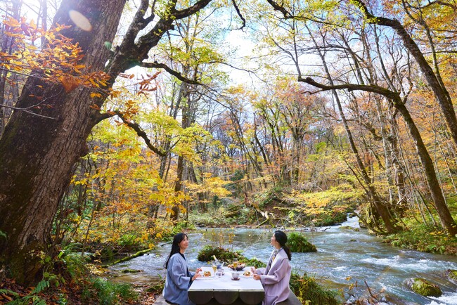 渓流沿いに建つ唯一のリゾートホテル「星野リゾート 奥入瀬渓流ホテル」では、2023年10月15日、美しくきらめく紅葉を眺め、彩り豊かなランチを楽しむ「渓流紅葉ランチ」が新登場します。光が差し込み、きらきらと黄金色に輝く森と、渓流を目の前に眺めながら、紅葉の景色をイメージしたランチとシャンパーニュを楽しめます。紅葉の絶景とランチのマリアージュを味わう時間はこの上ない贅沢です。