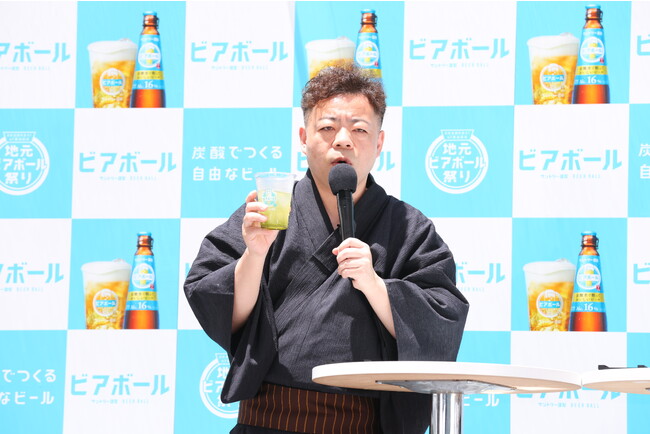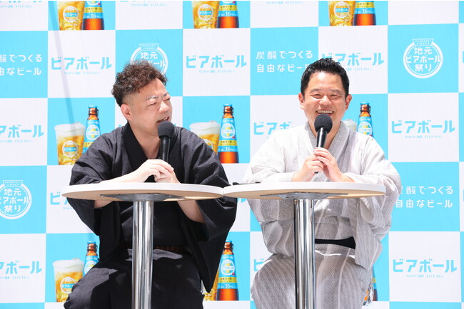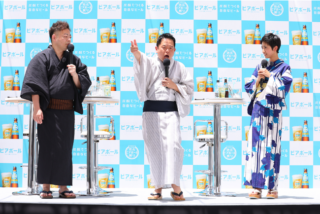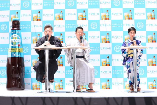 MCからの「日本全国を巡る!47都道府県 地元ビアボール祭り」の紹介やビアボールの商品紹介を受けて、これまでCMや公式YouTubeにてビアボールづくりを体験している黒島さんは「自分の好きな濃さに調整できるので楽しいです。最近暑くなってきたので少し薄めにして飲むのがおすすめです」とコメント。さらに、今回のイベントで楽しめる47都道府県「地元ビアボール」のメニュー一覧を見て、「こんなにメニューあるんですか!?滋賀の味もあるんですね!」と興味津々の津田さん。ユースケさんは「こんなにメニューあるのがびっくりです。色々な種類を飲んでみたいです」と様々な味や見た目を楽しめる地元ビアボールへの期待を膨らませました。