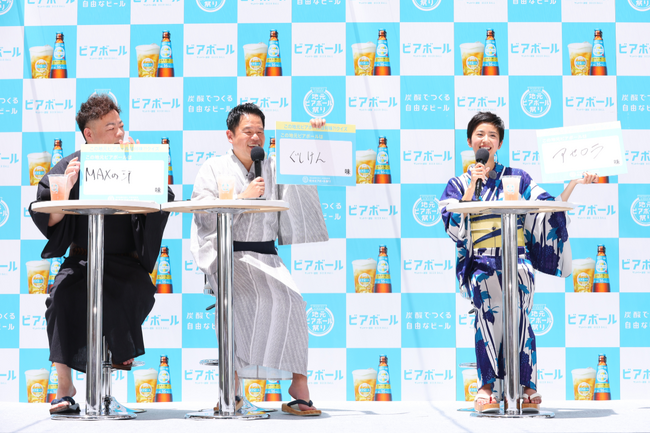 「レモンのさっぱりした爽やかな感じとビールのうま味があっていて美味しいです。」と感想をいただきました。愛知の「愛知西尾抹茶ビアボール」で乾杯したユースケさんは「ほどよい風味でめっちゃおいしい!」と、お茶割とビールの相性について語っていただきました。津田さんはダイアンお二人の地元滋賀の「滋賀アドベリービアボール」を飲み、「素晴らしい酸味が・・・とても・・・美味しいです!!ほどよい苦みが相まって女性にもおすすめです!」とコメントし、会場を笑いに包みました。