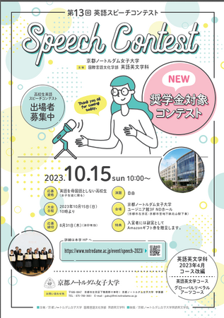 京都ノートルダム女子大学(学長:中村久美、所在地:京都府京都市左京区)は、高校生対象「第13回英語スピーチコンテスト」を開催します。