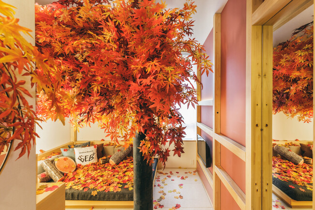 もみじを1万枚以上、ふんだんに設えた紅葉まみれのお部屋を用意します。昨年はソファのみでしたが映える!と、とても人気だったため今年は紅葉の木を設え、ベッドも紅葉で埋め尽くしました。二段構造になっているヤグラ寝台の1階のソファや2階のベッド部分には、まるで色鮮やかな絨毯のようにもみじが広がっており、仲間と思いっきりばらまいて写真や動画を撮るもよし!もみじの上に寝転がって、のんびり夜通しおしゃべりするもよし!室内でも紅葉を存分に楽しむことができます。