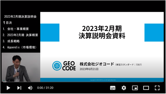 Webマーケティングとクラウドセールステックを展開する株式会社ジオコード(本社:東京都新宿区、代表取締役:原口大輔、東証スタンダード:7357)は、6月21日に実施した決算説明会の動画を本日よりYouTubeで公開しました。