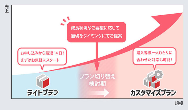まずは「ライトプラン」をご利用いただき、後に事業が拡大すれば、成長状況やご要望に応じて、最適なタイミングにて「カスタマイズプラン」への切り替えをご提案。