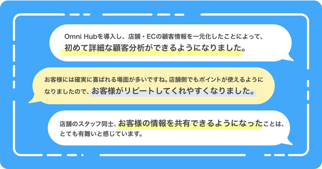 Omni Hubを利用することで「店舗・ECの会員統合が簡単にできた」「お客さまのことをより理解できるようになった」といった声を多くの事業者さまからいただいています。