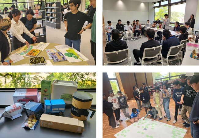 「テーマパーク作り」プロジェクトは美術や英語、数学、経営学の授業に引き継がれました。美術ではお店の模型作成や粘土を用いた商品創作を、英語の授業では広告で使われる英語表現を学習のねらいとした広告ポスター作成活動を行いました。さらに、経営学では顧客を惹きつけるための商品パッケージについて学び、参加者は個性あふれるさまざまな形状のパッケージを制作しました。制作にあたり、数学の授業では理想のパッケージを立体にするための展開図を作図し、どのような寸法や形の紙を作れば思い通りのパッケージができるのかを試行錯誤しました。