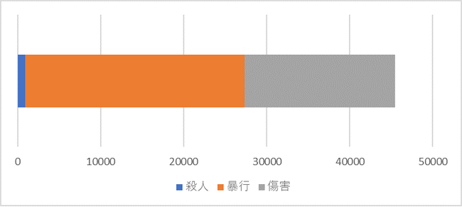 殺人:874件 暴行:26,436件 傷害:18,145件 合計45,455件となっています。