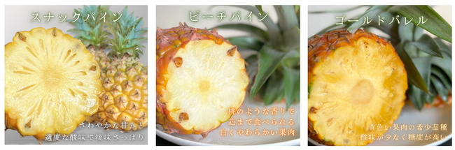 自慢のパイナップルは、「スナックパイン」「ピーチパイン」「ゴールドバレル」の3品種をメインに13種類以上のパイナップルを栽培しています。