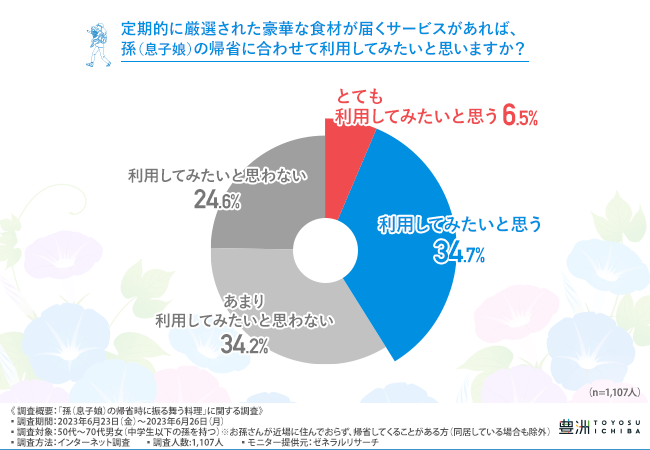 そこで、「定期的に厳選された豪華な食材が届くサービスがあれば、孫(息子娘)の帰省に合わせて利用してみたいと思いますか?」と質問したところ、4割以上の方が『とても利用してみたいと思う(6.5%)』『利用してみたいと思う(34.7%)』と回答しました。