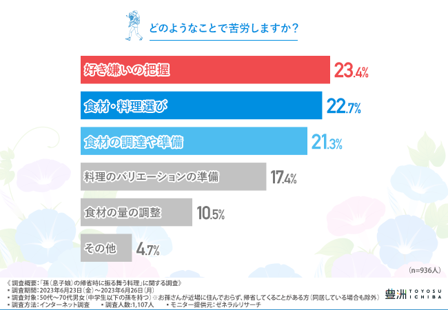 「どのようなことで苦労しますか?」と質問したところ、『好き嫌いの把握(23.4%)』と回答した方が最も多く、次いで『食材・料理選び(22.7%)』『食材の調達や準備(21.3%)』と続きました。