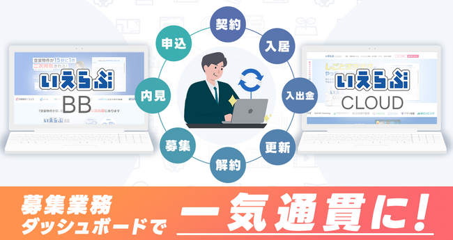 「いえらぶBB」は「いえらぶCLOUD」と同時に利用することで、空室物件の掲載・内見受付・申込み・契約などの募集業務から入居後の管理、更新・解約対応まで一気通貫でサポートします。このたび、募集業務をさらに効率化するダッシュボード機能を実装しました。
