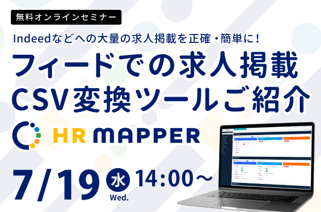 無料ウェビナー【7/19(水)14:00~】【人材派遣・求人広告代理店向け】indeedなどへの大量の求人掲載を正確・簡単に!フィードでの求人掲載・CSV変換ツールご紹介セミナーに登壇いたします。