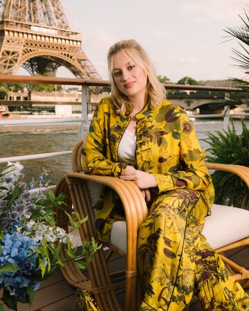 ナディア・テレスツィエンキーヴィッツは、2023年フォール コレクションより、プリントがあしらわれたイエローシルクのシャツにパンツ、ホワイトトップを合わせた装いを披露。