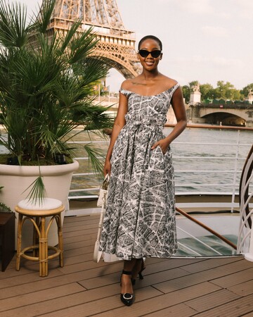 トゥソ・ムベドゥは、2023年春夏 コレクションより、「プラン ドゥ パリ」モチーフがあしらわれたドレスを纏い登場。