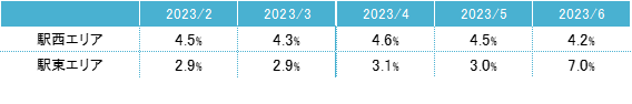 空室率は前月比プラス0.46ポイントの5.08%となり、2022年10月以来となる5%台に上昇した。6月に竣工した新築ビルがまとまった面積の空室を抱えており、上昇要因となっている。エリア別では「駅東」が前月比プラス4.0ポイントと大幅に上昇した。潜在空室率は前月比プラス0.45ポイントの6.47%だった。主要エリアにある既存の大規模ビルでは、いずれの募集床もテナントの引き合いがある状況となっており、品薄感が継続している。
