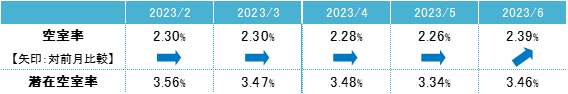 空室率は前月比プラス0.13ポイントの2.39%となった。6ヵ月ぶりで小幅に上昇したが、2%台の低水準は18ヵ月連続となっている。本社ビルに集約移転したテナントの解約床が現空となり、主な上昇要因となっている。潜在空室率は前月比プラス0.12ポイントの3.46%だった。オフィス需要が堅調な一方、主要エリアでは小口の面積帯で品薄感が漂っており、複数の引き合いを集める募集床も散見される。