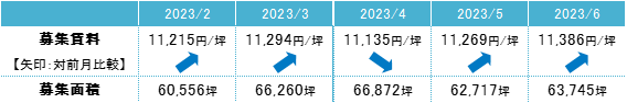 募集賃料は前月比プラス117円/坪の11,386円/坪となった。2ヵ月連続の上昇で、統計開始以来の最高値を更新した。