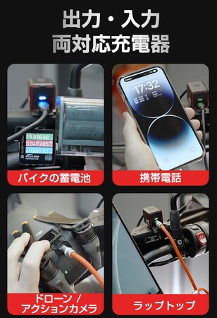 バイクバッテリー充電ースマホやPC充電双方向充電対応!革新技術で緊急時のバッテリー充電可能