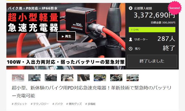 世界初!Makuakeで応援購入総額300万円突破 - 世界最小級のバイク用100W急速充電器 TR100、本日AKEEYO公式オンラインストアにて発売開始