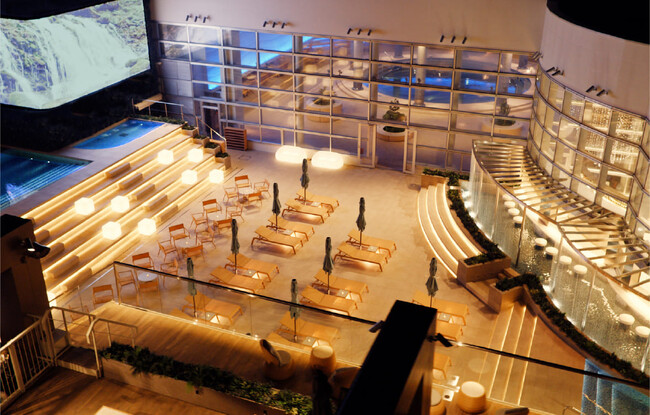 屋外エリアには、通天閣が一望できるインフィニティプールや、滝が流れるバーカウンター、ファミリーで利用できるパーソナルブース、デッキチェアが設置されており、ゆったりとした空間で贅沢な時間を過ごすことができます。