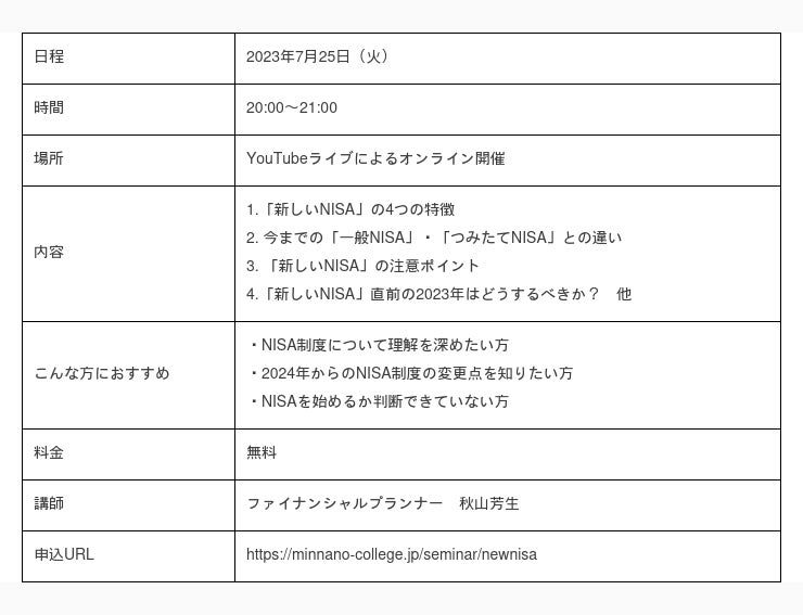 ▶7月25日(火)開催 無料ウェビナー「新しいNISA徹底開設セミナー」の申込はこちら: