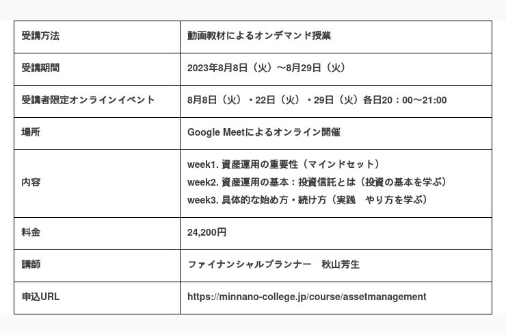 ▶8月開講 みんなのカレッジ「資産運用入門コース」の申込はこちら:
