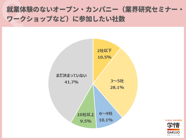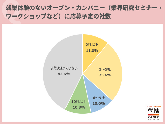 オープン・カンパニー(業界研究セミナーやワークショップなど就業体験のないプログラム)について、応募を予定している社数は「まだ決まっていない」を除くと、「3~5社」25.6%が最多となりました。次いで「2社以下」11.0%、「10社以上」10.8%、「6~9社」10.0%と続きます。
