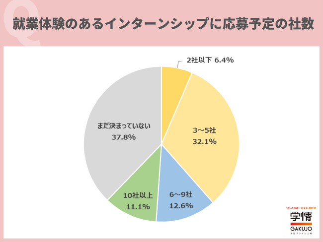 就業体験が可能なインターンシップについて、応募を予定している社数は「まだ決まっていない」を除くと、「3~5社」32.1%が最多となりました。次いで「6~9社」12.6%、「10社以上」11.1%が続きます。複数のインターンシップへの応募を予定していることが分かります。