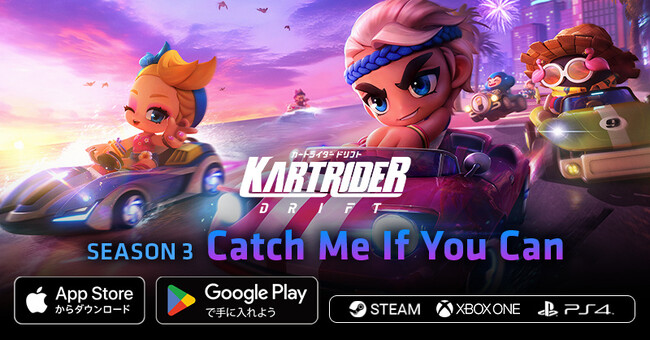 バーチャルワールドの制作及び運用を行う株式会社ネクソン(本社:東京都港区、代表取締役社長:Owen Mahoney/オーウェン・マホニー、東証:3659、以下 ネクソン)は、次世代マルチプラットフォーム・レーシングゲーム『カートライダー ドリフト』(KartRider: Drift)において、2023年7月13日(木)より、ゲーム内の新シーズン「シーズン3: Catch Me If You Can」をスタートいたします。