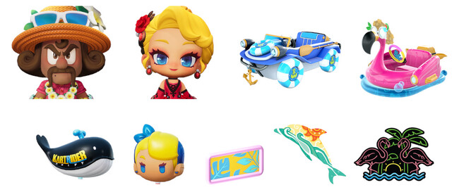 レーシングパスの報酬内容も、シーズン3の開幕に合わせてリニューアルいたしました。指定のレーシングパスレベルを達成するごとに、新キャラクターのコスチュームや、夏の季節にふさわしく海辺やお祭りをコンセプトにした新カート、ステッカーなど、様々な報酬をプレゼントいたします。