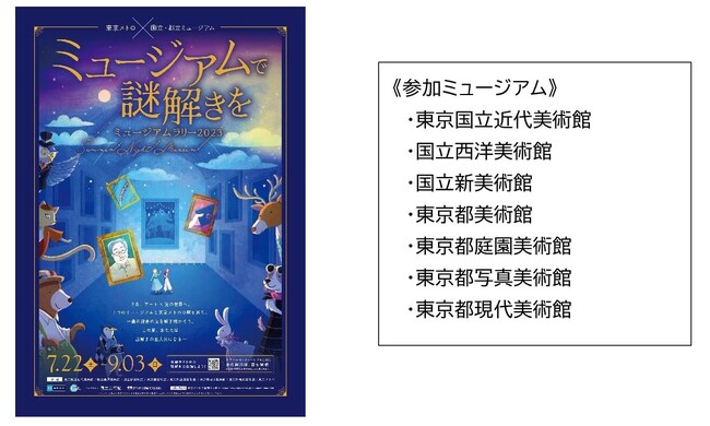 東京地下鉄株式会社(本社:東京都台東区、代表取締役社長:山村 明義、以下「東京メトロ」)、独立行政法人国立美術館(本部:東京都千代田区、理事長:逢坂 惠理子)、公益財団法人東京都歴史文化財団(本部:東京都千代田区、理事長:日枝 久)は、東京都内の国立・都立の7つのミュージアムと駅を巡って謎を解く、「ミュージアムラリー2023」を2023年7月22日(土)から 9月3日(日)まで合同で実施いたします。本ラリーは2019年の開催を最後に、新型コロナウイルスの影響等により実施しておりませんでしたが、今回4年ぶりに開催いたします。
