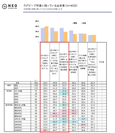 全体の回答を見ると、20%を切った項目が1つも無く、ひとつひとつの出来事のインパクトの大きさがうかがえます。2015年・2019年と、8~4年前の出来事でありながら「五郎丸ポーズ」や「ベスト8」「One Team」といったキャッチーなキーワードとともに、今でも当時の試合を鮮明に覚えている人が多いのではないでしょうか。