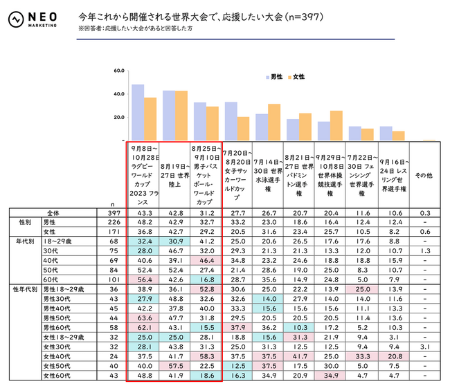 トップは「9月8日~10月28日ラグビーワールドカップ 2023 フランス」で43.3%、次いで「8月19日~27日 世界陸上」(以下、世界陸上)が42.8%、「8月25日~9月10日 男子バスケットボール・ワールドカップ」が31.2%で続きました。
