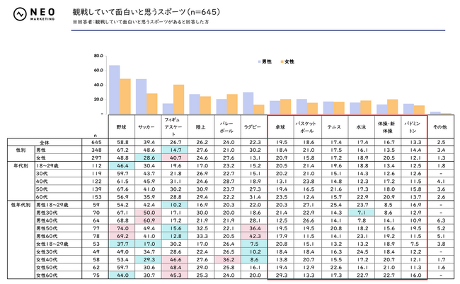 全体の結果を見ると、トップが野球で58.8%、そこにサッカーが続いている点は前掲した設問「今後、応援したいスポーツ」の傾向と同じですが、いくつかの競技において異なる傾向がみられます。特に、水泳は観戦していて面白いと思うスポーツとしては17.4%である一方で、今後応援したいスポーツとしては23.2%となっています。