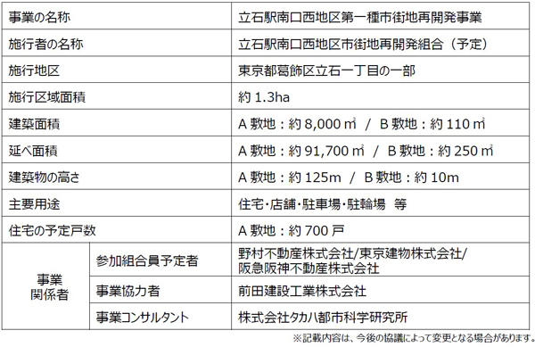 立石駅南口西地区市街地再開発準備組合(理事長:高野 新吉(※1) 以下、本準備組合)と、本準備組合に参加組合員予定者として参画している野村不動産株式会社(本社:東京都新宿区/代表取締役社長:松尾 大作)、東京建物株式会社(本社:東京都中央区/代表取締役 社長執行役員:野村 均)、阪急阪神不動産株式会社(本社:大阪市北区/代表取締役社長:諸冨 隆一(※2))は、本準備組合が進めている「立石駅南口西地区第一種市街地再開発事業(以下、本事業)」について、2023年7月12日付で、葛飾区より都市計画決定の告示を受けたことを、お知らせいたします。