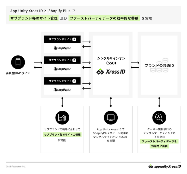 株式会社フィードフォース(所在地:東京都文京区、代表取締役:塚田 耕司、以下:フィードフォース)の「App Unity」は、グループ会社である株式会社フラクタ(所在地:東京都渋谷区、代表取締役:河野 貴伸、以下:FRACTA)と共同で、Shopify Plusサイトに簡単にシングルサインオン(SSO)環境を実現できるソリューション「App Unity Xross ID」をリリースいたします。