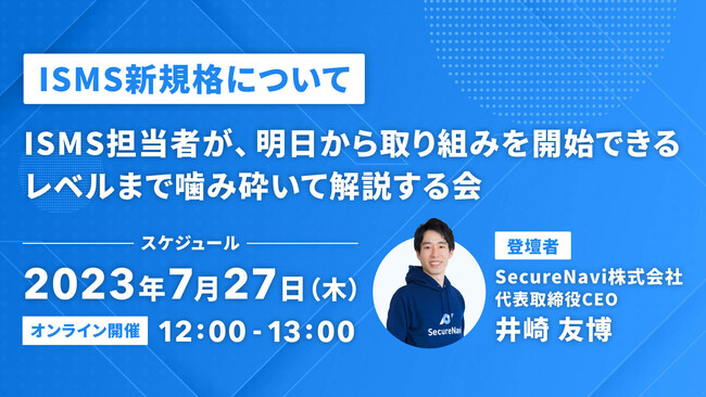 ISMS・Pマークオートメーションツール「SecureNavi」を提供するSecureNavi株式会社(本社:東京都中央区、代表取締役CEO:井崎友博 以下、当社)は、ISMS担当者に向け、ISMS認証の新しい審査基準「ISO/IEC27001:2022」へのセミナーを改訂直後から行ってきました。開催の都度、ご好評・再開催のお声をいただき、今回3度目の開催となりました。「明日から取り組みを開始できる」をテーマに、わかりやすく解説いたします。
