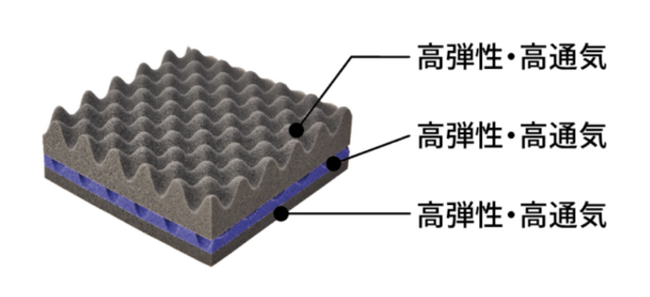 凹凸3フォーム構造の全層に寝返りをサポートし湿気を拡散する、高弾性・高通気ウレタンを使用しています。