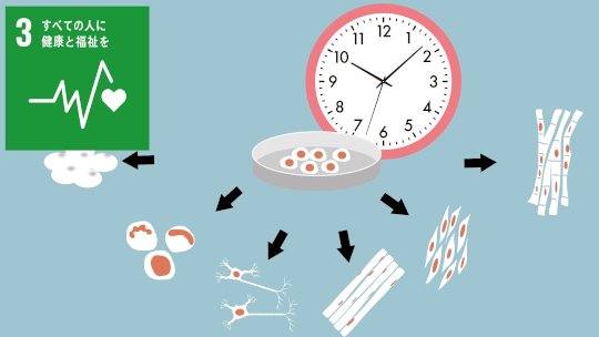 時計機構が作動したiPS細胞(‘ticking’iPS細胞)ではあらゆる体細胞になれる能力(多能性)は保持しているが、無限に分裂する能力(増殖能)が顕著に抑制されていた。