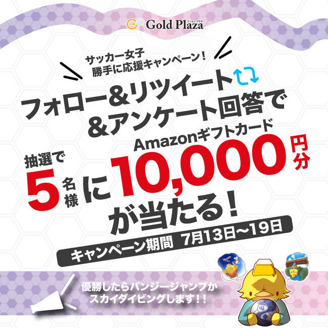 人材を活用したセールスプロモーション、人材派遣事業を行なう株式会社マーキュリー (本社:東京都新宿区西新宿1-26-2新宿野村ビル23階、代表取締役:林 正和)が展開するゴールドプラザでは貴金属・ブランド品・ 宝石を業界最高水準の安心買取りで累計56万人のお客様にご利用いただいております。店舗での買取をはじめLINE査定、宅配買取など、各種お客様に合わせたお買取り方法にも対応しており、また情勢の動きなども敏感に察知し情報を発信しております。そんなゴールドプラザでは7/13よりTwitterにて女子サッカー国際大会での優勝を祈願したAmazonギフト券プレゼントキャンペーンを開催します。