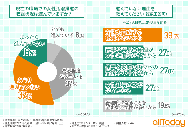 【オールトゥデイ|調査レポート】半数以上の方が、現在の職場で女性活躍推進の取組は進んでいないと回答!