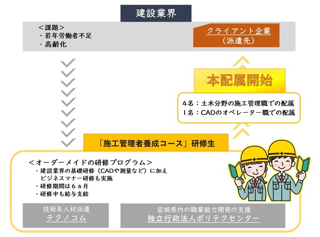 テクノコムは、建設業界の若手人材不足の中、継続的に自社で人材を教育・育成していくことで、有為な人材を安定的に供給することを目指し、本事業を今年1月にスタートしました。