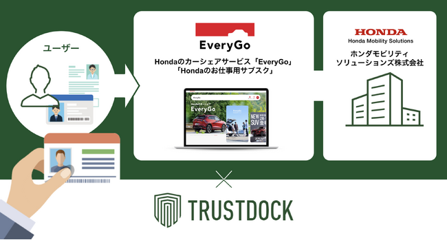 株式会社TRUSTDOCK(本社:東京都千代田区、代表取締役:千葉 孝浩、以下 TRUSTDOCK)は、ホンダモビリティソリューションズ株式会社(本社:東京都港区、代表取締役:高見 聡、以下ホンダモビリティソリューションズ)が運営・提供する「EveryGo」「Hondaのお仕事用サブスク」に、eKYC本人確認サービス「TRUSTDOCK」を導入したことをご報告します。