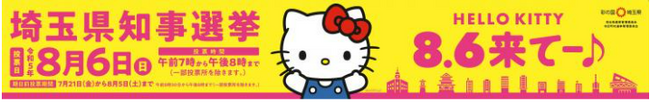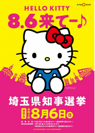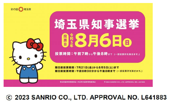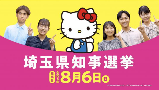 令和5年8月6日執行の埼玉県知事選挙では、「ハローキティ」を啓発イメージキャラクターに迎え、選挙啓発事業を展開することにより、選挙への関心の向上及び若者に対する啓発強化を図ります。