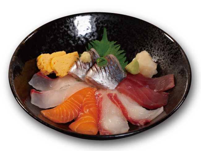 目利きのバイヤーが厳選した、まぐろ・カンパチ・サーモン・真鯛・アジ・玉子焼きを大きな器に盛付。ボリューム満点の見た目も華やかな海鮮丼です。