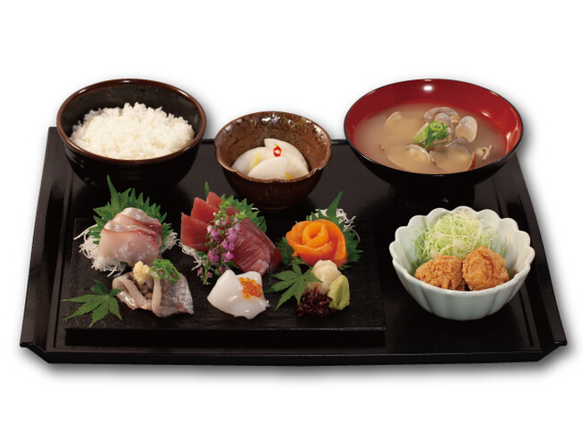 すし松でも人気の食材を盛付けた「お刺身5点盛」に、松のや自慢の「本格唐揚げ」と、すし松自慢の「あさりの味噌汁」が付いたボリューム満点の御膳。ライス大盛無料。