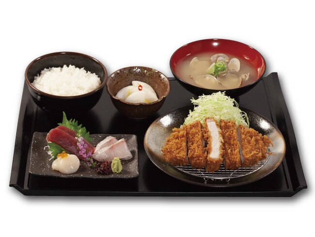 旨みが凝縮された熟成チルドポーク、サクッと香ばしい特製パン粉を使用した松のや自慢の看板メニュー「上ロースかつ」をメインに、すし松自慢の「刺身3点盛」と「あさりの味噌汁」が付いたこちらもボリューム満点の御膳。ライス大盛無料。