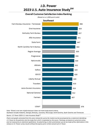 【南東部】Farm Bureau Insurance - Tennessee(テネシー・ファーム・ビューロー)(866 ポイント、12年連続の総合満足度第1位)