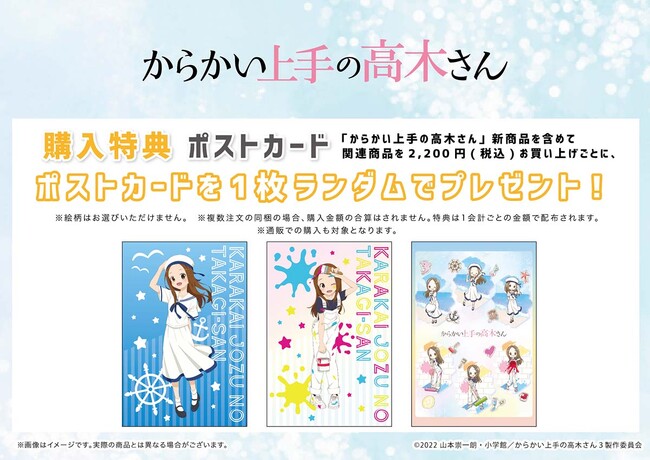 『からかい上手の高木さん』新商品を含めて関連商品を1会計2,200円(税込)お買い上げごとに、購入特典ポストカード(全3種)をランダムで1枚プレゼント。