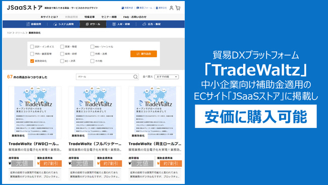 貿易プラットフォーム「TradeWaltz」の中小企業利用拡大に向け、補助金申請をサポートし約7割引価格で購入できるJSaaSストアに掲載